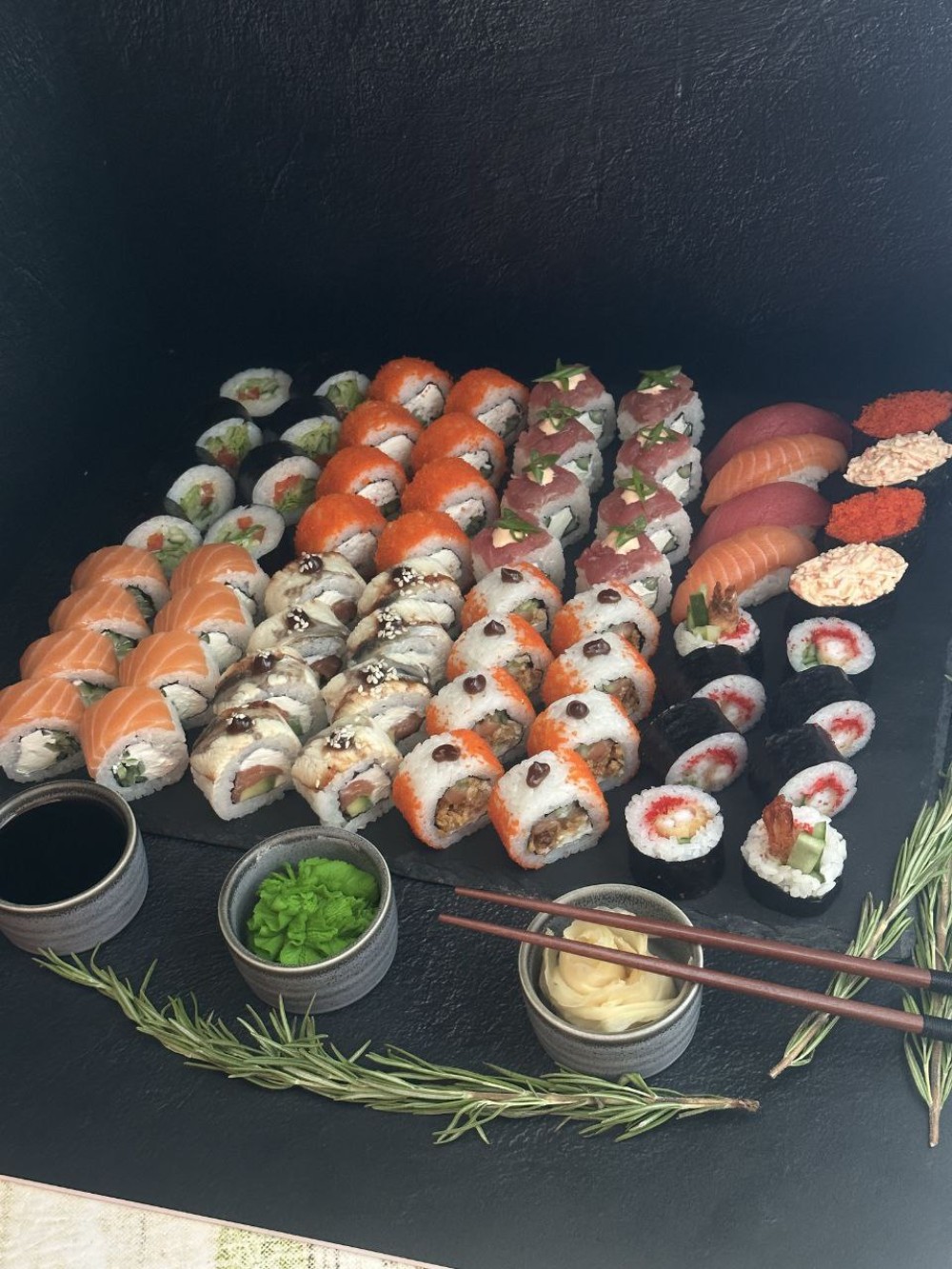 Канада, Кани чиз, сяке фри, кайсо ролл, Фила ролл, динамит, Тар-Тар Туна ролл, Хаманиши ролл, Суши лососем 2 шт, суши тунцом 2 шт, гункан масаго 2 шт, гункан Кани 2 шт.