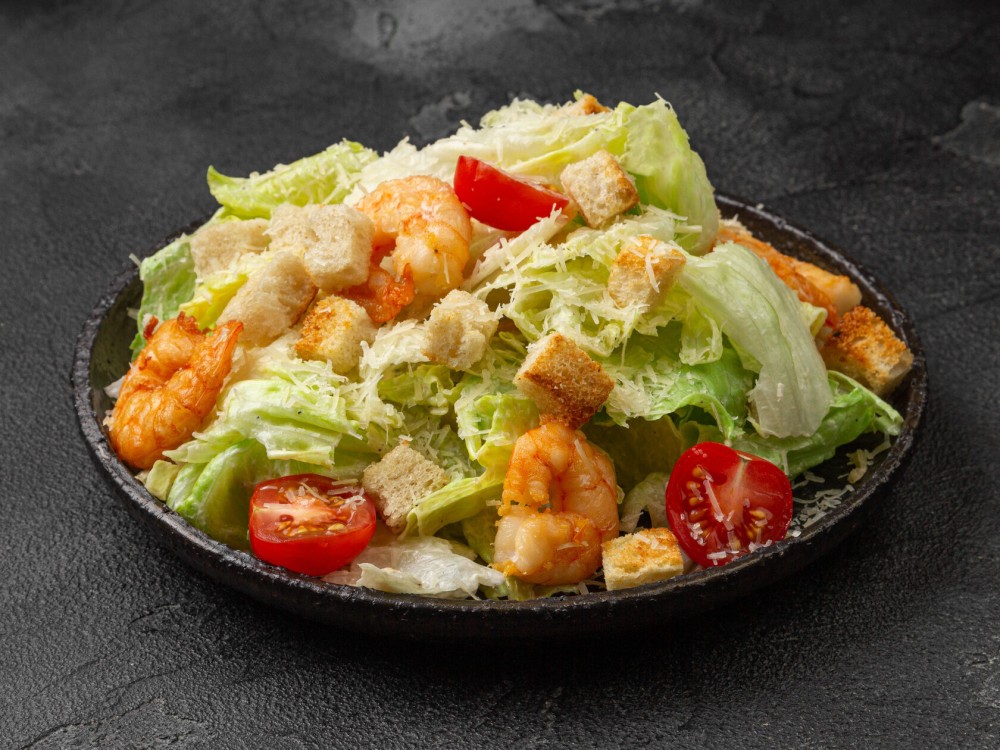 Салат айсберг, креветки, пармезан, яйцо, гренки, соус цезарь, томаты
