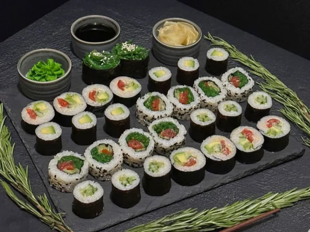 Хаманиши ролл, Кайсо ролл, Авокадо маки, Каппа маки, чука гункан 2шт. В сет входит 2 соевых соуса (2*30мл), 1 васаби 15гр, 1 имбирь 30гр