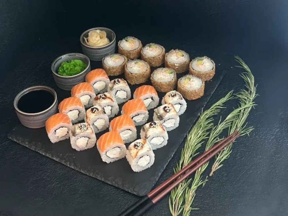Фила лайт, Унаги лайт, Хот кани спайси ролл. В сет входит 2 соевых соуса (2*30мл), 1 васаби 15гр, 1 имбирь 30гр