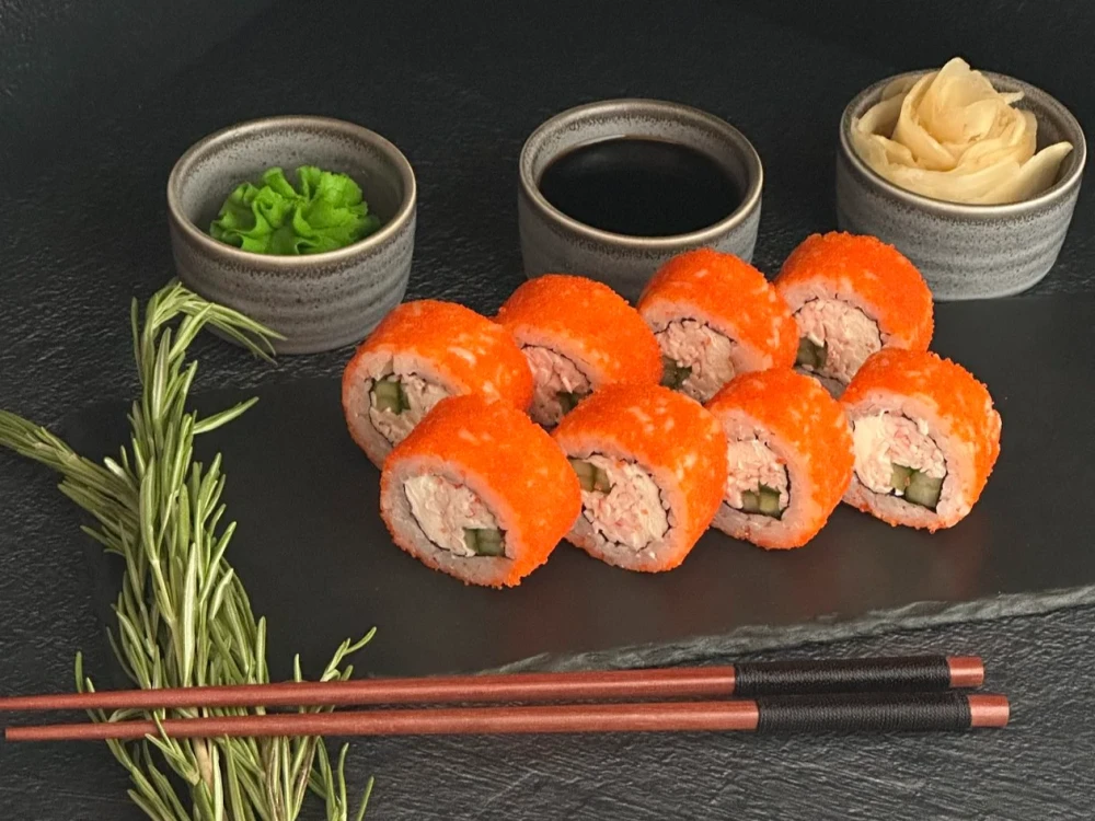 Краб-микс, сыр "Филадельфия", огурец, икра летучей рыбы, рис, нори.