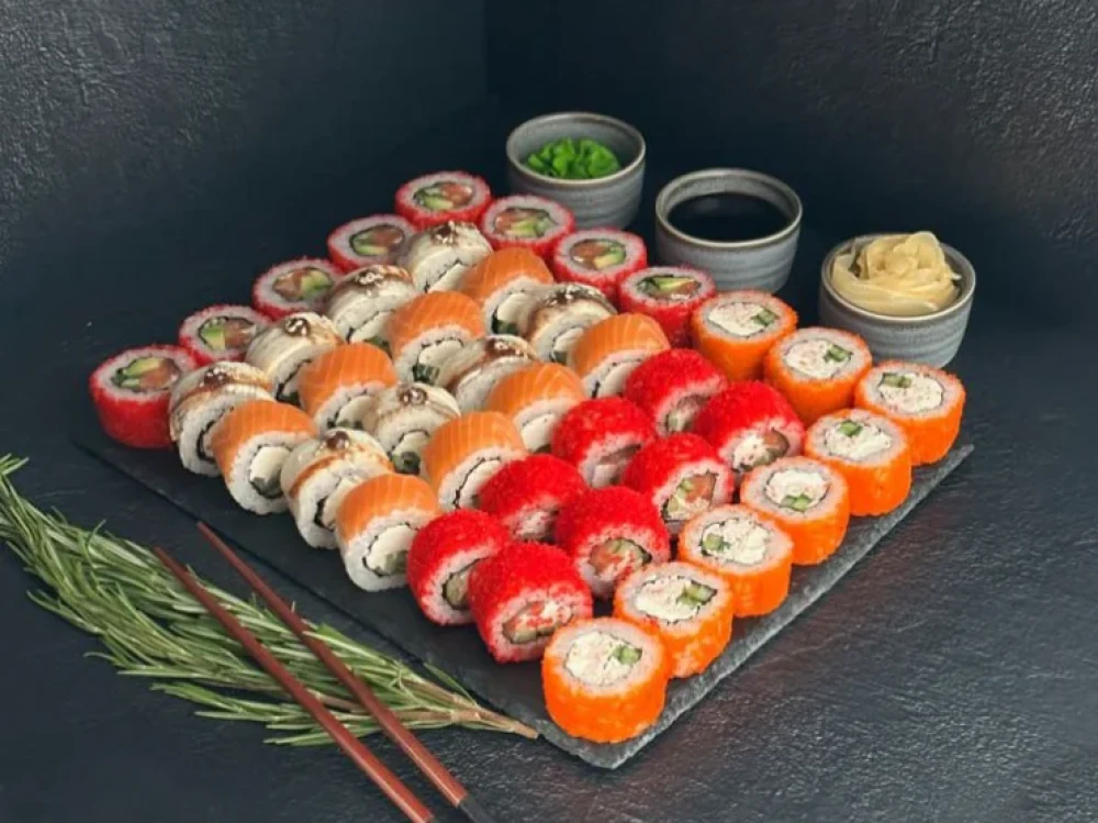 Сяке калифорния ролл, Филадельфия ролл, Дракон ролл, Кани чиз ролл, Салмон фиш ролл. В сет входит 2 соевых соуса (2*30мл), 1 васаби 15гр, 1 имбирь 30гр