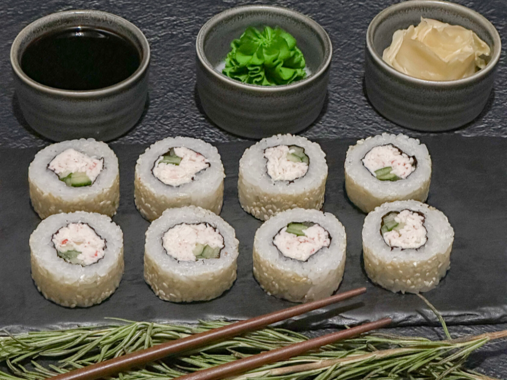 Японский майонез, краб-микс, огурец, кунжут белый, рис, нори.