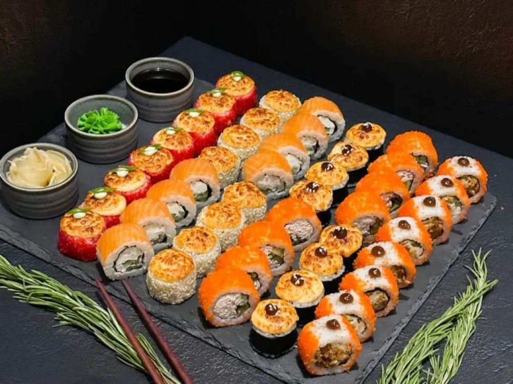 Сяке фри, Филадельфия ролл, Кани чиз ролл, Запеченный с крабом, Запеченный с курицей, Запеченный с угрем. В сет входит 2 соевых соуса (2*30мл), 1 васаби 15гр, 1 имбирь 30гр