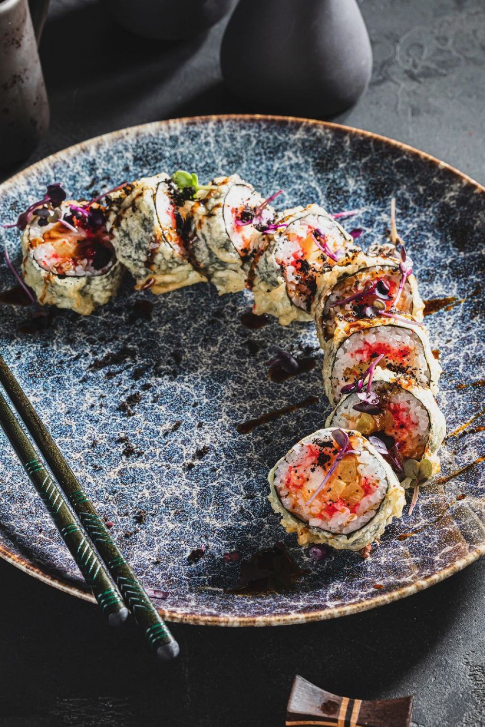 Лосось, креветка отварная, соус спайси, маринованный дайкон, стружка тунца, тобико, кунжут