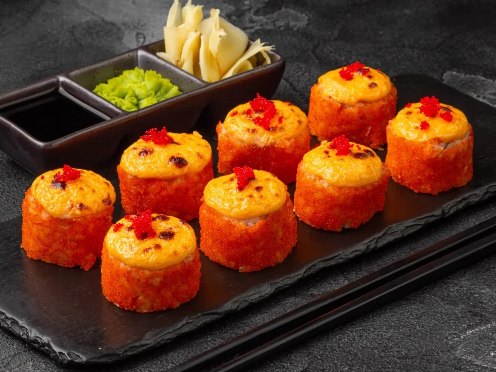 Сыр "Филадельфия", тигровая креветка, огурец, икра летучей рыбы, соус запеченный