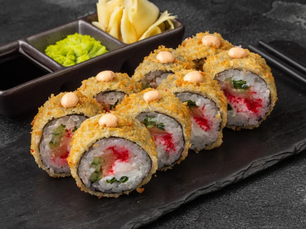 Лосось сыр огурец масаго, лук зеленый, темпурный кляр, сухари панко, спайси соус